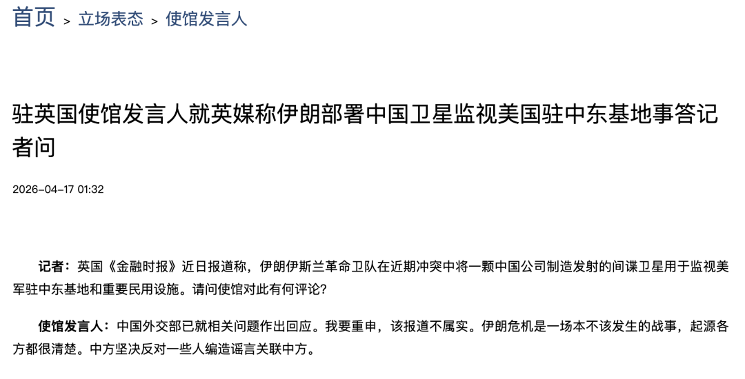 4月17日,中国驻英国使馆发言人就英媒称伊朗部署中国卫星监视美国驻中东基地事答记者问。