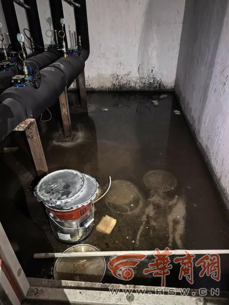 在2号楼下顺着过道经过一间室内地上满是很粗的管道且装有压力表的地方,大家看到里面不仅积水深,而且臭不可闻。