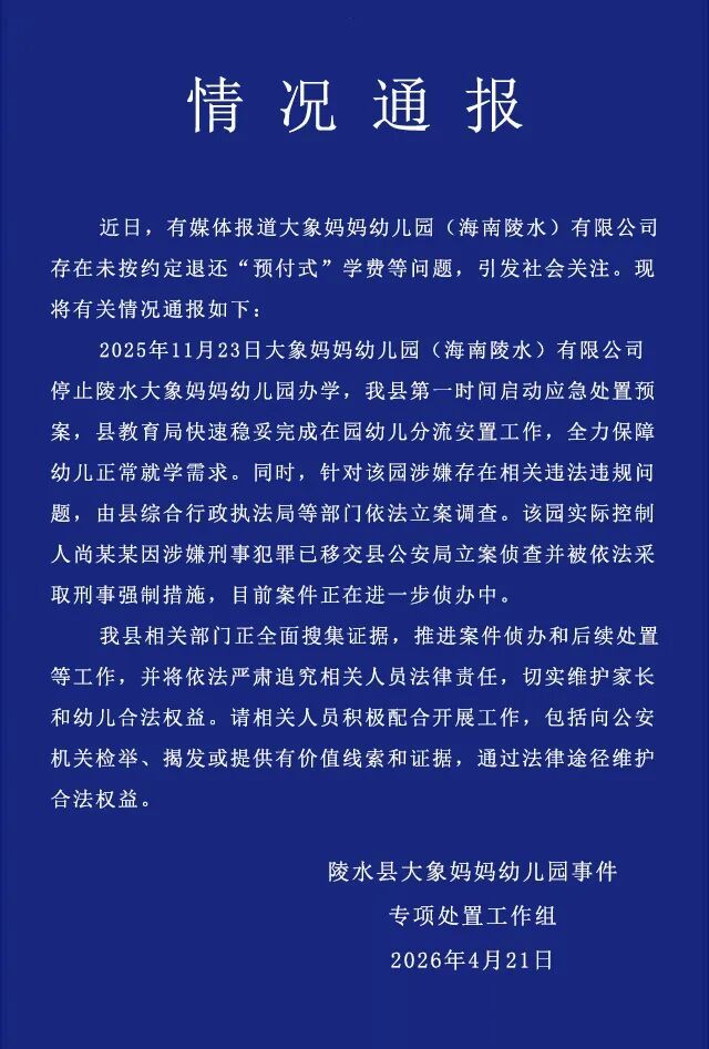 海南陵水通报大象妈妈幼儿园闭园事件,详情如下: