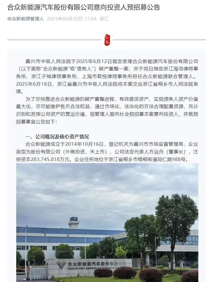 2025年6月30日,哪吒汽车母公司(合众新能源汽车股份有限公司)管理人发布《合众新能源汽车股份有限公司意向投资人预招募公告》,宣布面向社会预招募意向投资人。参与报名的意向投资人需提供包括但不限于投资计划预案、复工复产方案、职工安置方案、重整后企业运营方案等在内的投资方案。
