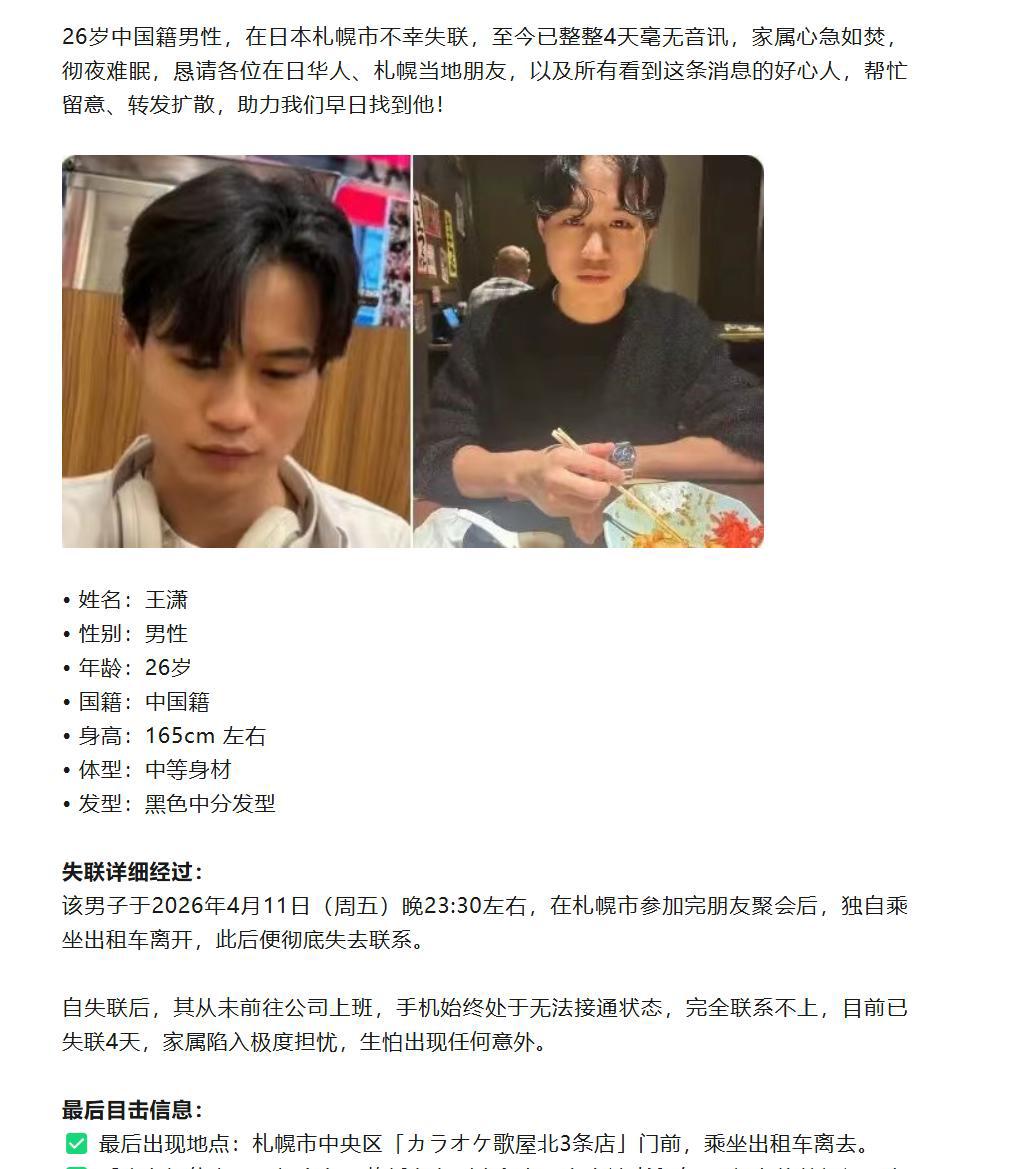 据寻人启事信息显示,王潇,身高165cm左右,中等身材,发型为黑色中分,于2026年4月11日23时30分左右,在日本札幌市参加完朋友聚会后,独自乘坐出租车离开,此后便彻底失去联系。自失联后,其从未前往公司上班,手机始终处于无法接通状态,家属完全联系不上。