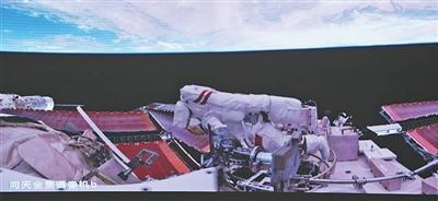 在北京航天飞行控制中心屏幕上拍摄的陈中瑞在空间站组合体舱外工作画面。 新华社记者 厉彦辰 摄