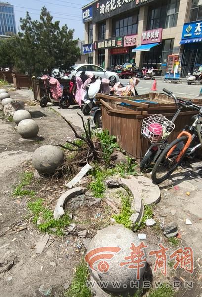 此外,华宇时间城行人出入的东1门外,一侧人行道上设立的隔离桩被拆掉,砖块散落一地,地面坑洼不平。