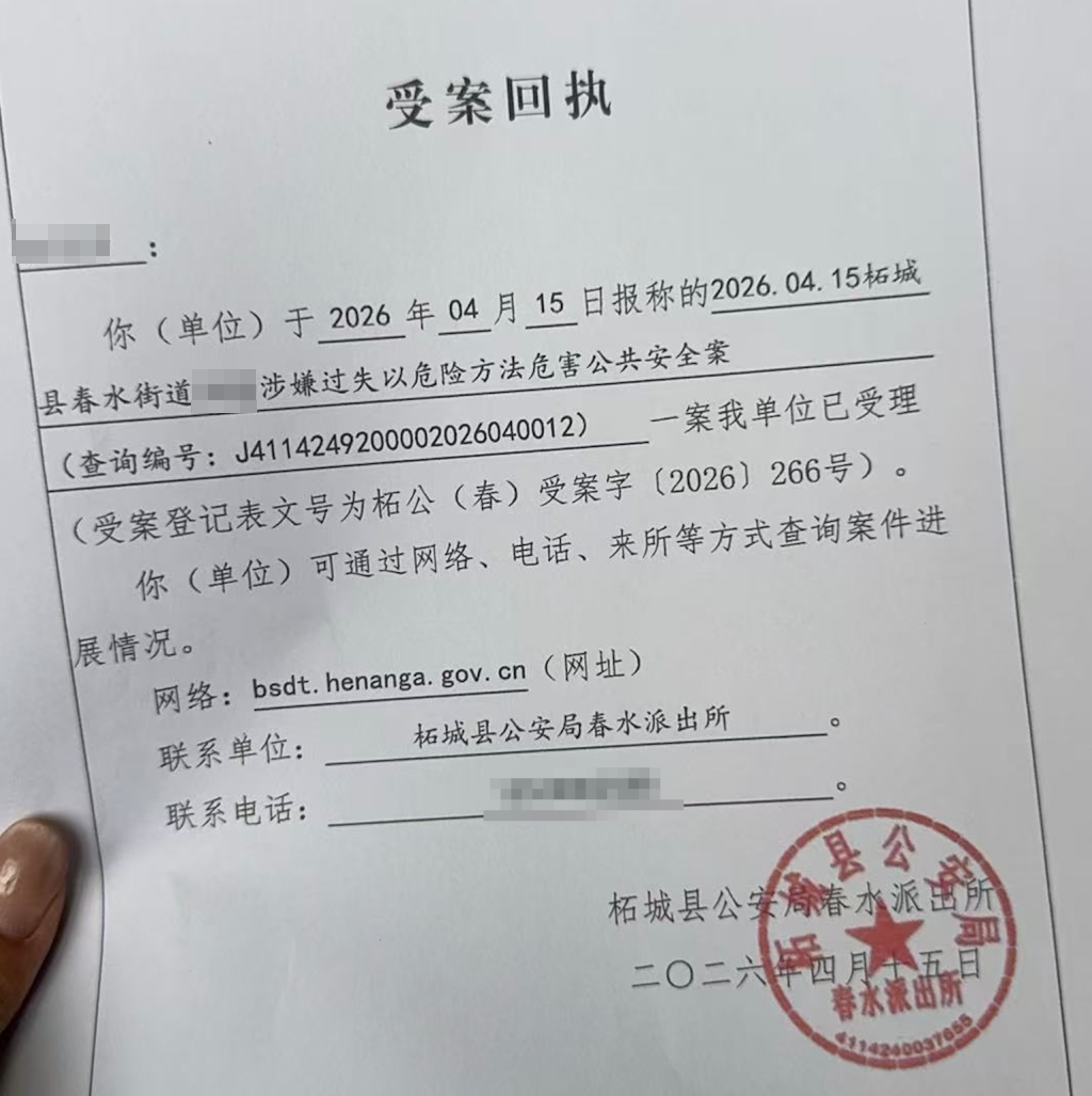 朱晨阳家属认为3楼业主涉嫌过失以危险方法危害公共安全,曾向警方报案。2026年4月15日,柘城县公安局春水派出所出具受案回执。目前,案件还在受案调查过程中。