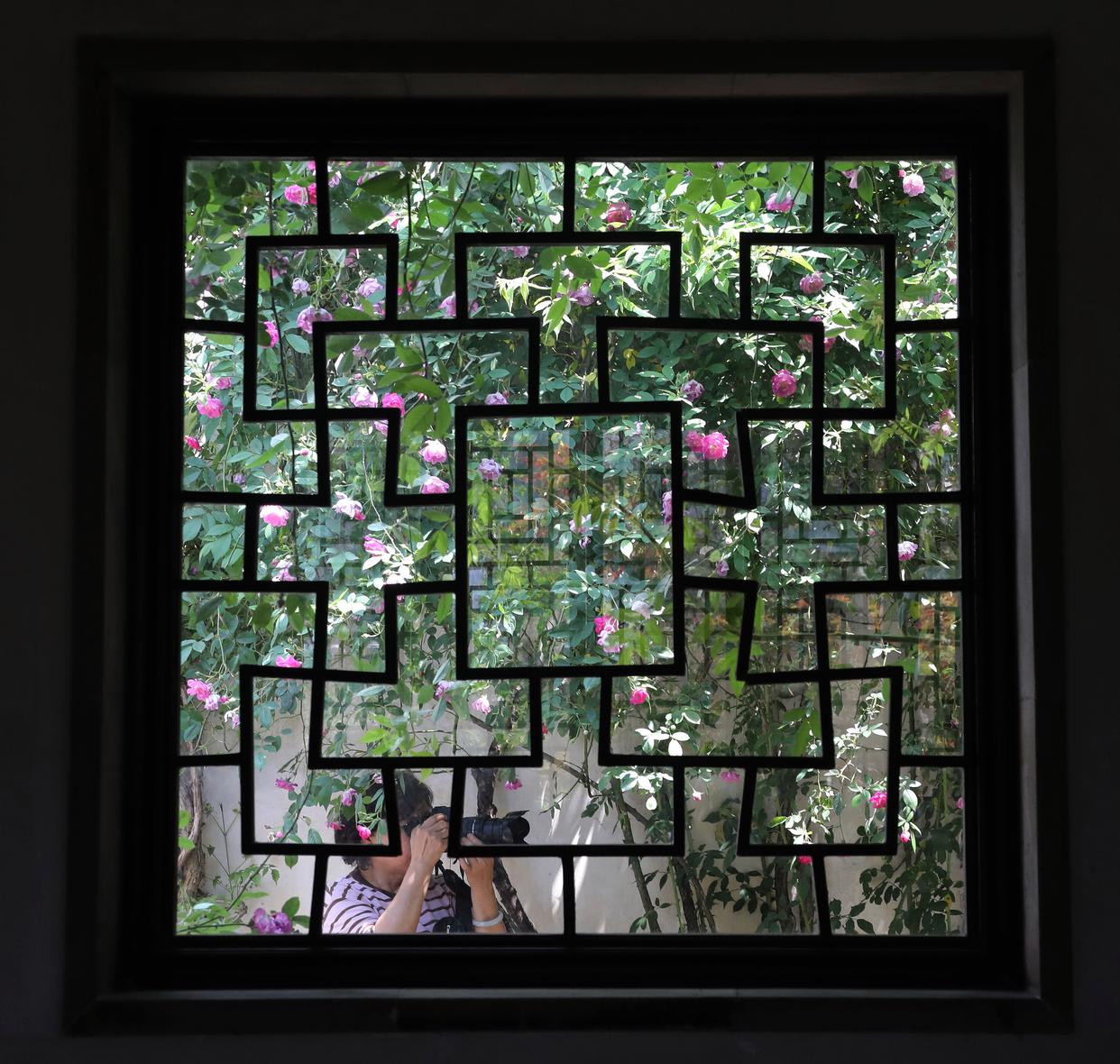 4月24日,游客在江苏苏州艺圃赏花拍照。新华社发(杭兴微摄)