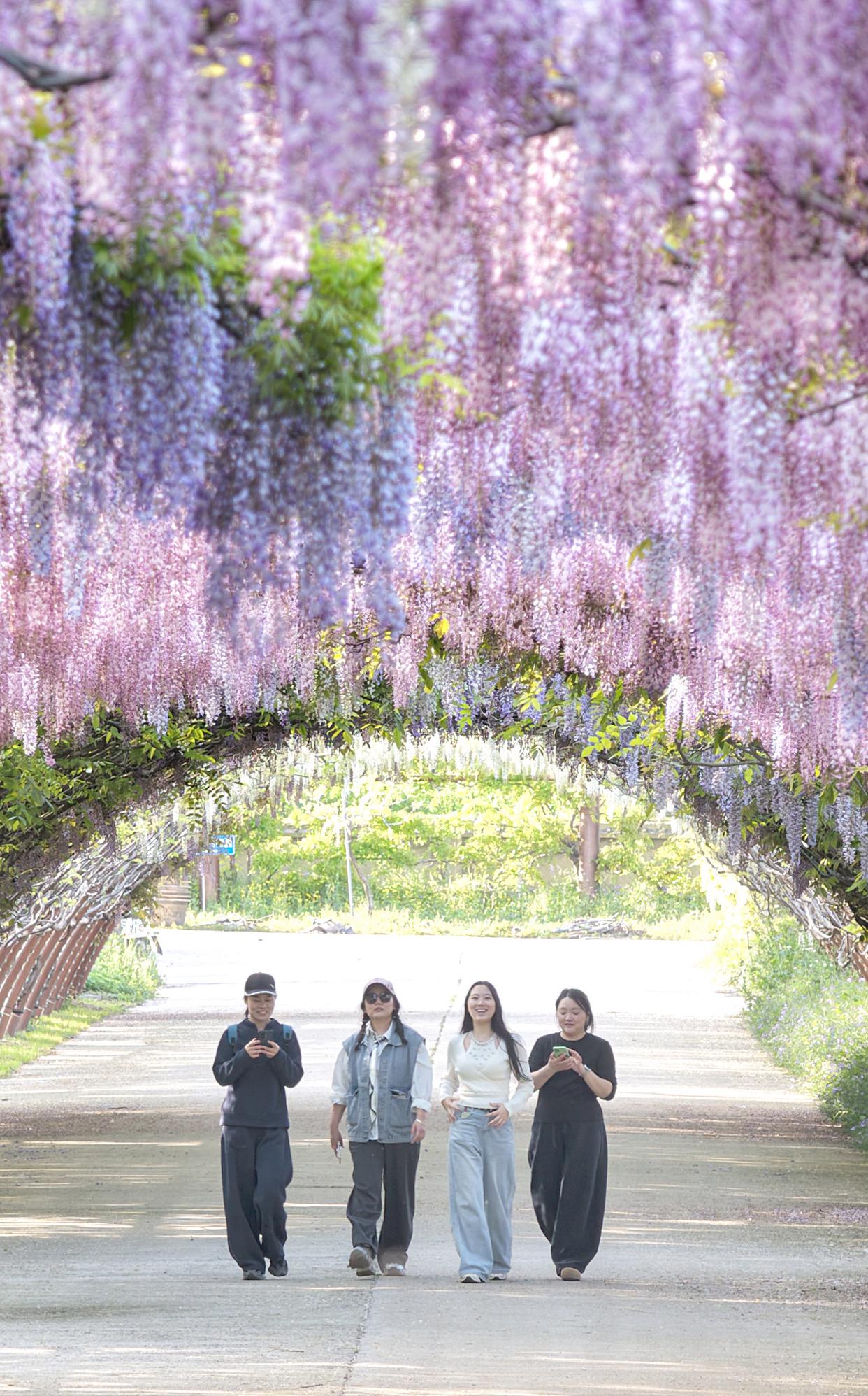 4月24日,人们在江苏南通洲际梦幻岛紫藤花谷欣赏盛开的紫藤花。新华社发(许丛军摄)