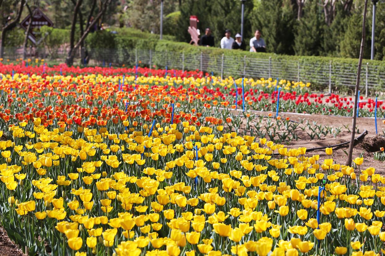 4月25日,市民在甘肃省定西市安定区一处公园内赏花游玩。新华社发(王克贤摄)