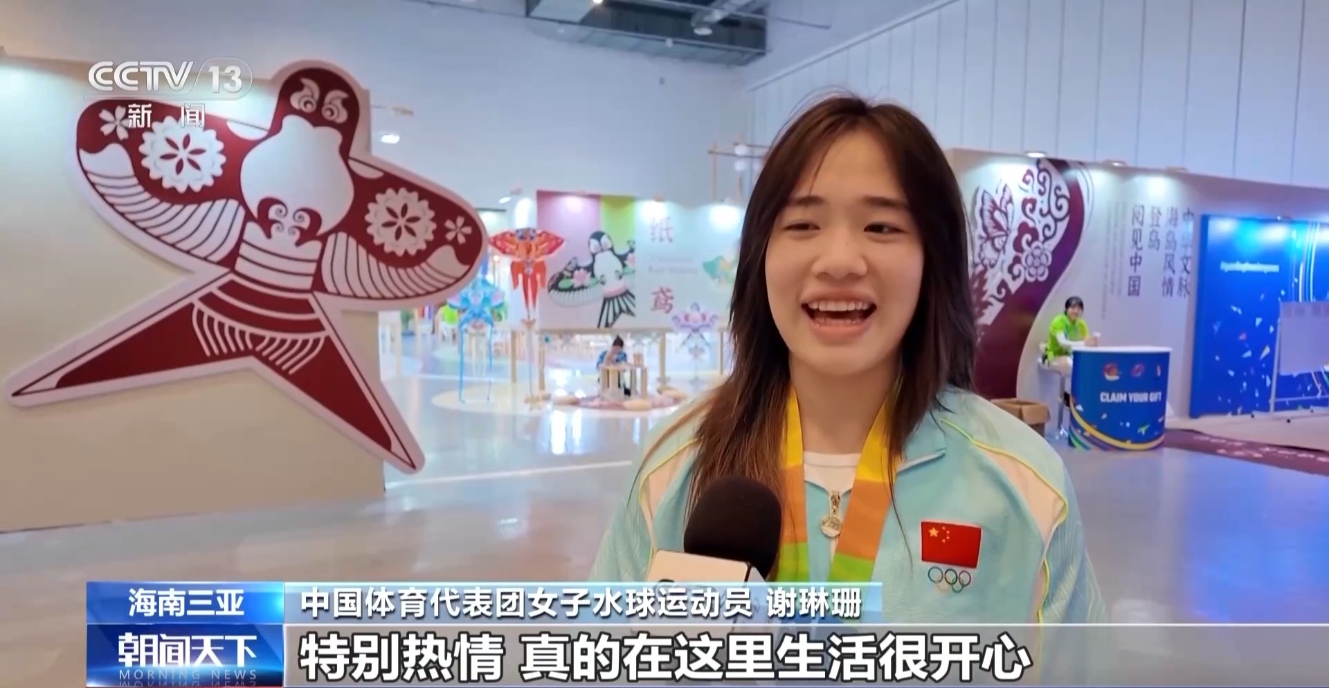 中国体育代表团女子水球运动员 谢琳珊:我们空闲的时候会去力量房做一些拉伸活动,或者是一点跑动之类的,下楼就可以到。每天有大巴车接送,也有工作人员带我们,特别热情,真的在这里生活很开心。