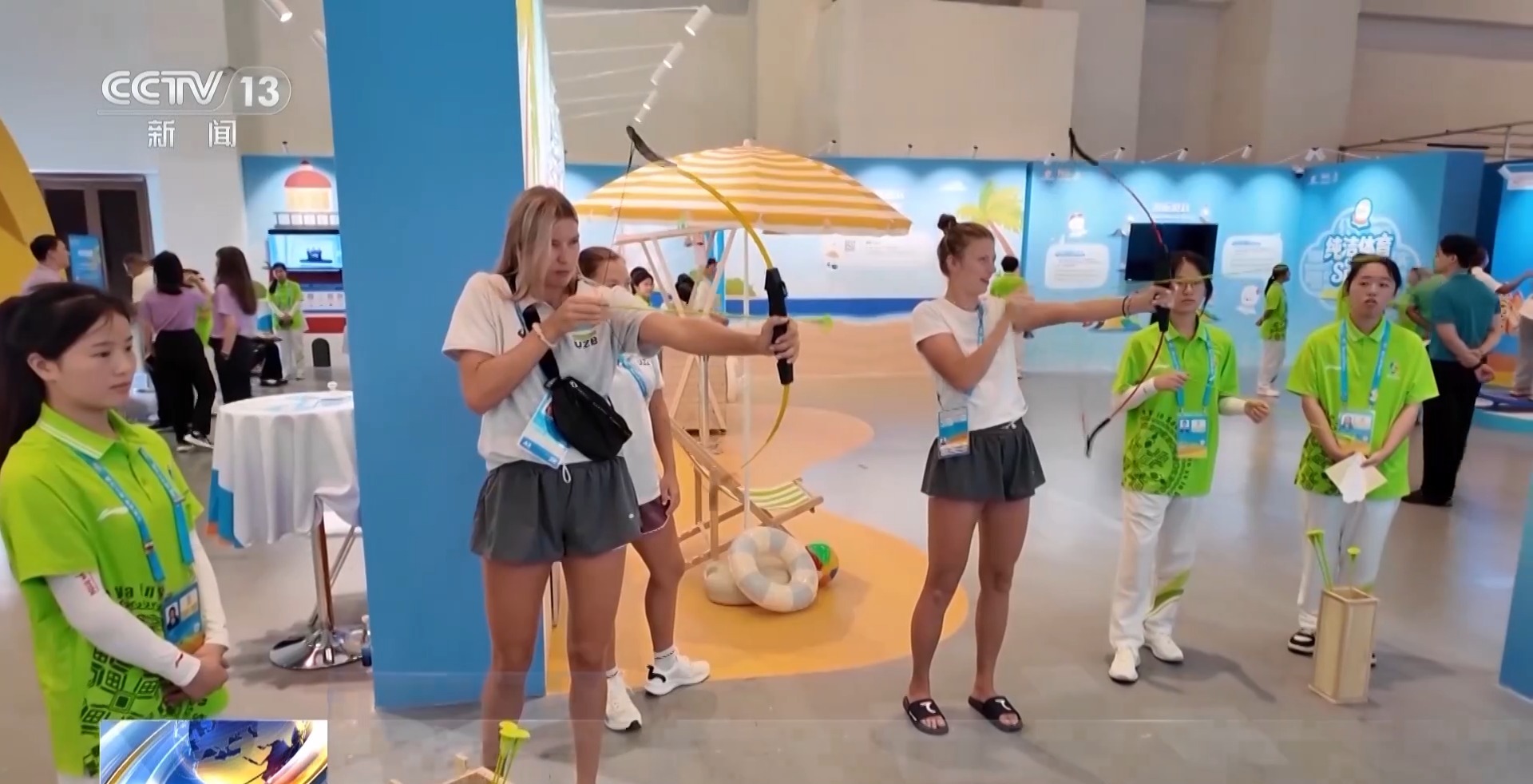 每天上午,在运动员村活动区,射箭比拼、限时拼图,以及科技感十足的电子冲浪板等互动游戏,吸引许多运动员和随队工作人员参与体验。
