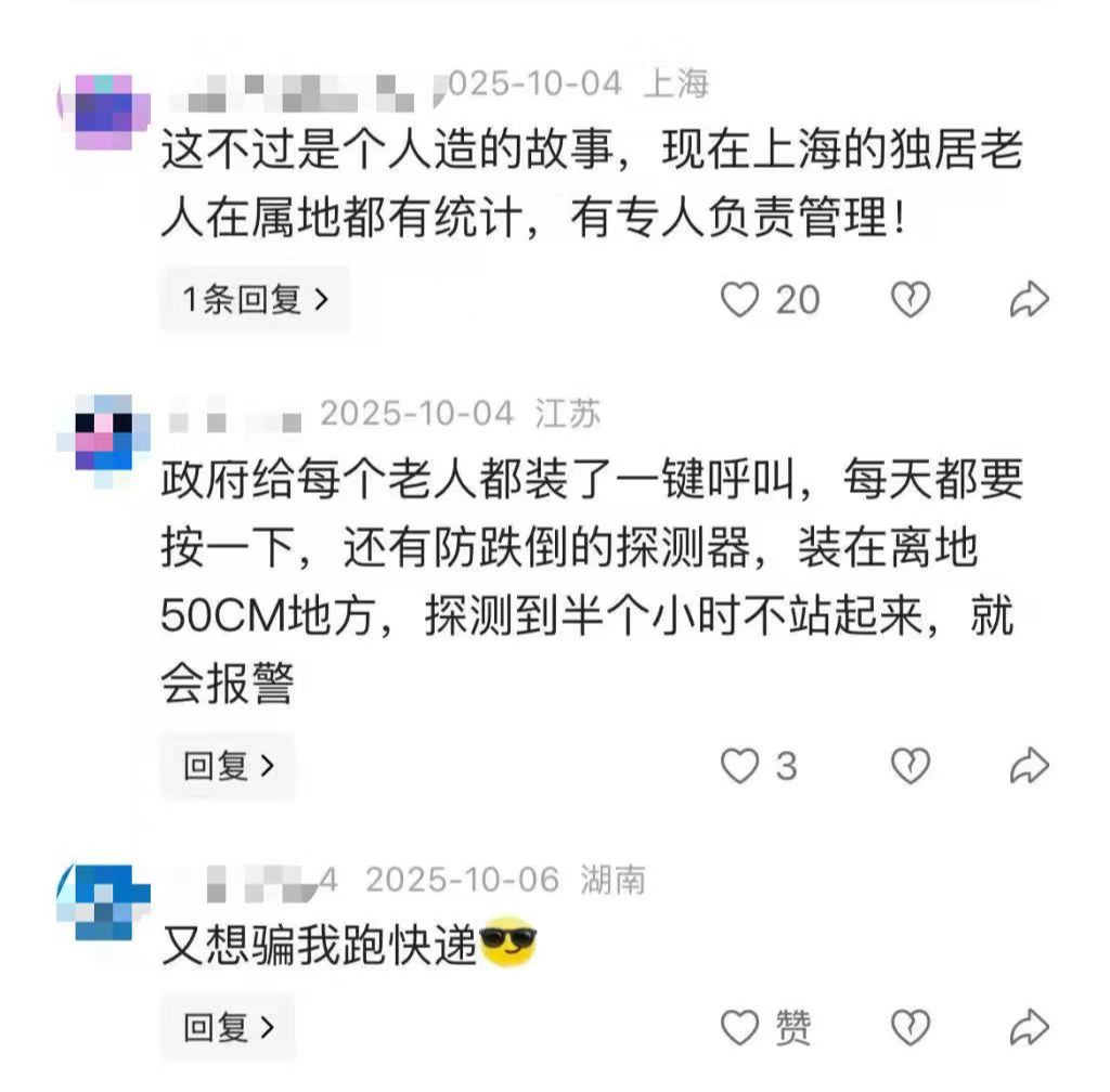 记者注意到,早在2025年10月的相关帖子下面,就有不少网友质疑:“假的”“这不过是个人造的故事,现在上海的独居老人在属地都有统计,有专人负责管理”……