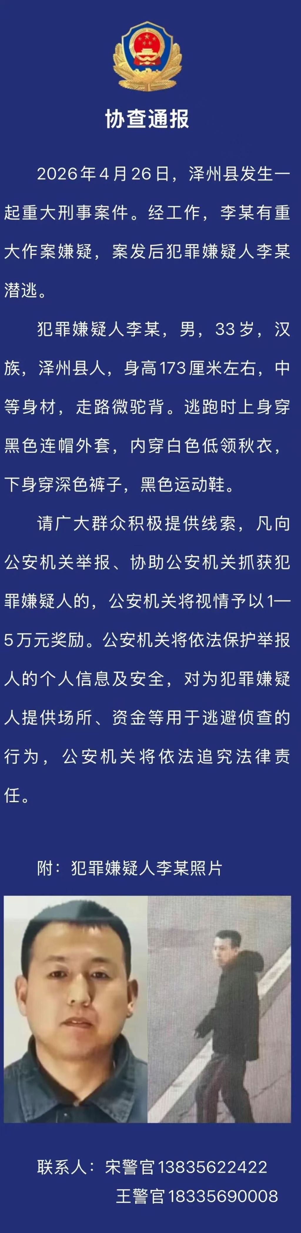 犯罪嫌疑人李某,男,33岁,汉族,泽州县人,身高173厘米左右,中等身材,走路微驼背。逃跑时上身穿黑色连帽外套,内穿白色低领秋衣,下身穿深色裤子,黑色运动鞋。
