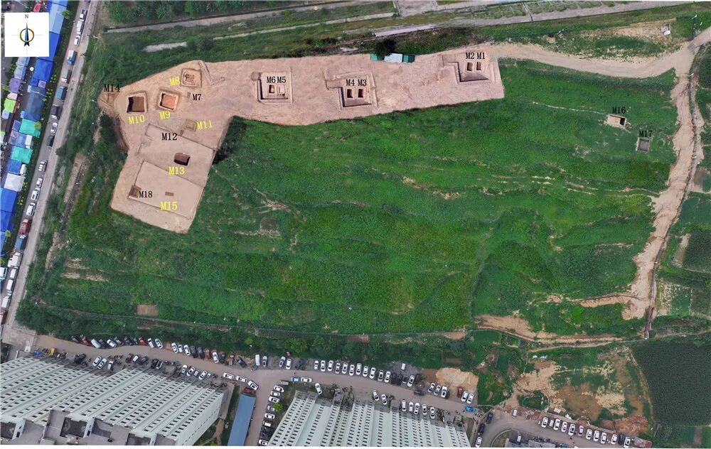 钟村遗址墓葬分布航拍照(黄色墓号为夏商墓葬)